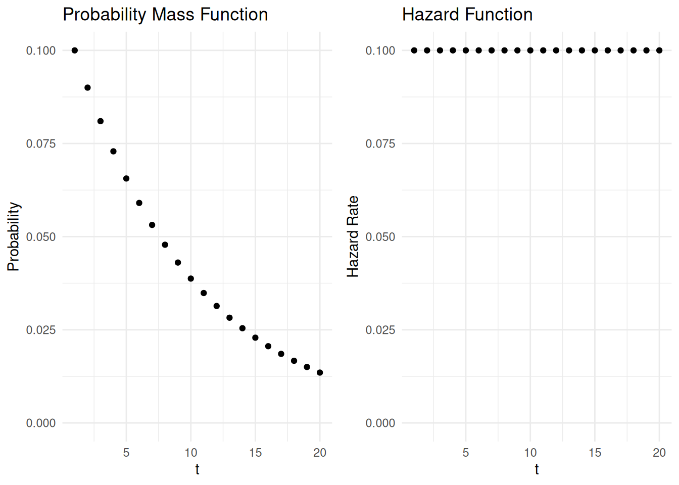 Example: Suppose I have a fair ten-sided die. Let \(t\) be the number of rolls until I get a one. The figures below show the probability mass and hazard function.