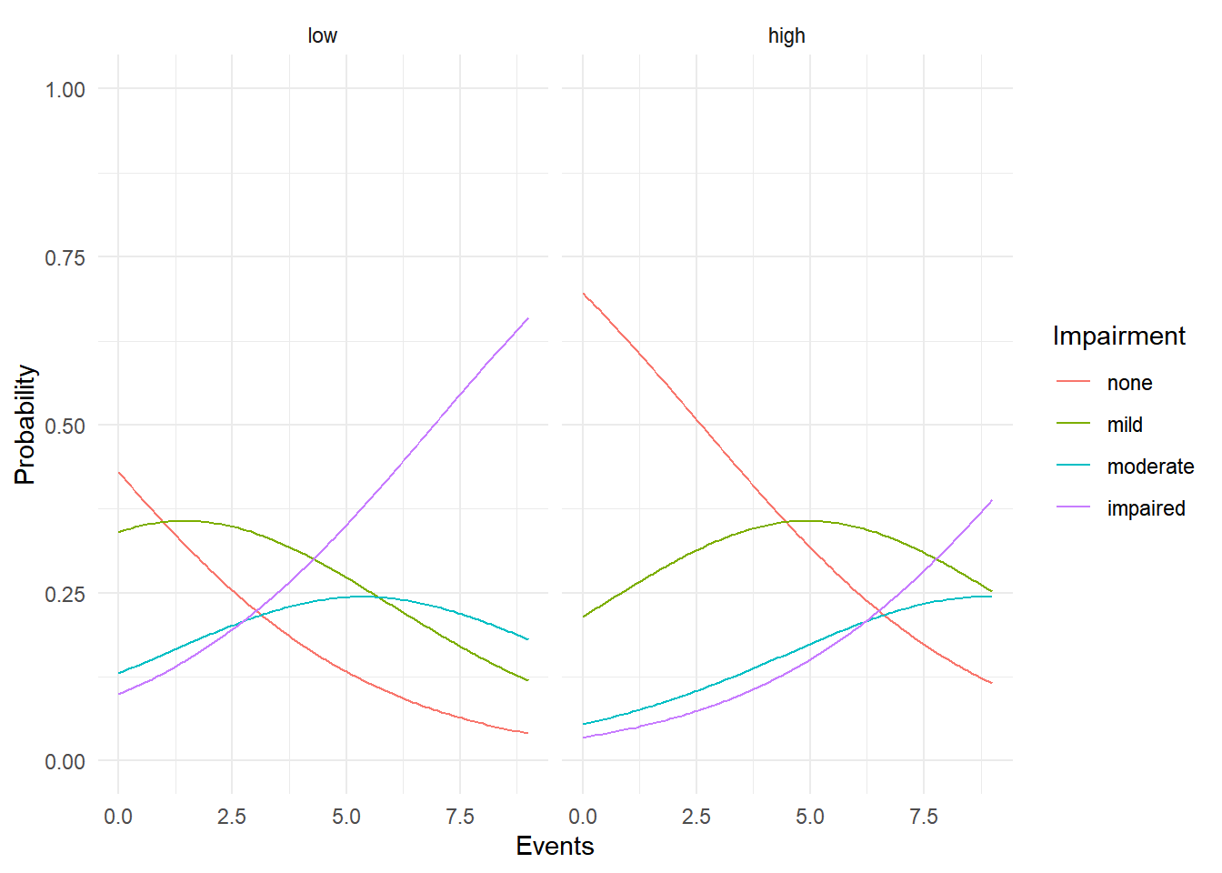 labs(x = "Events", y = "Probability", color = "Impairment")