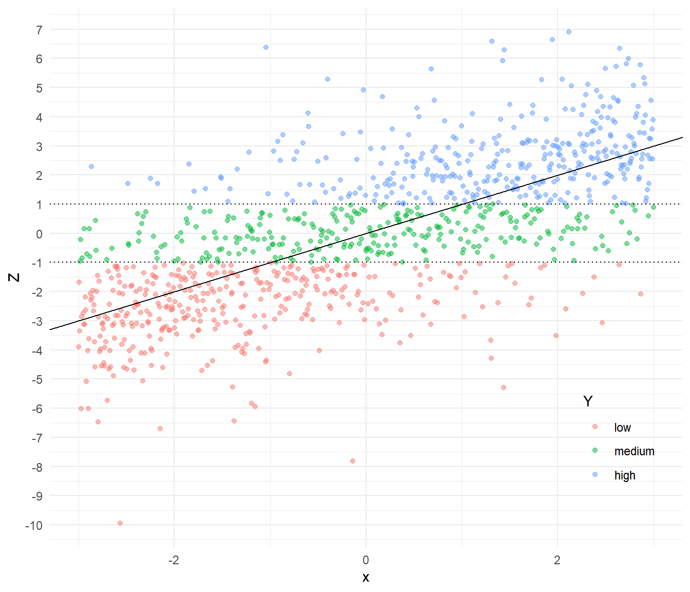 y <- cut(z, c(-Inf, -1, 1, Inf), labels = c("low","medium","high"))